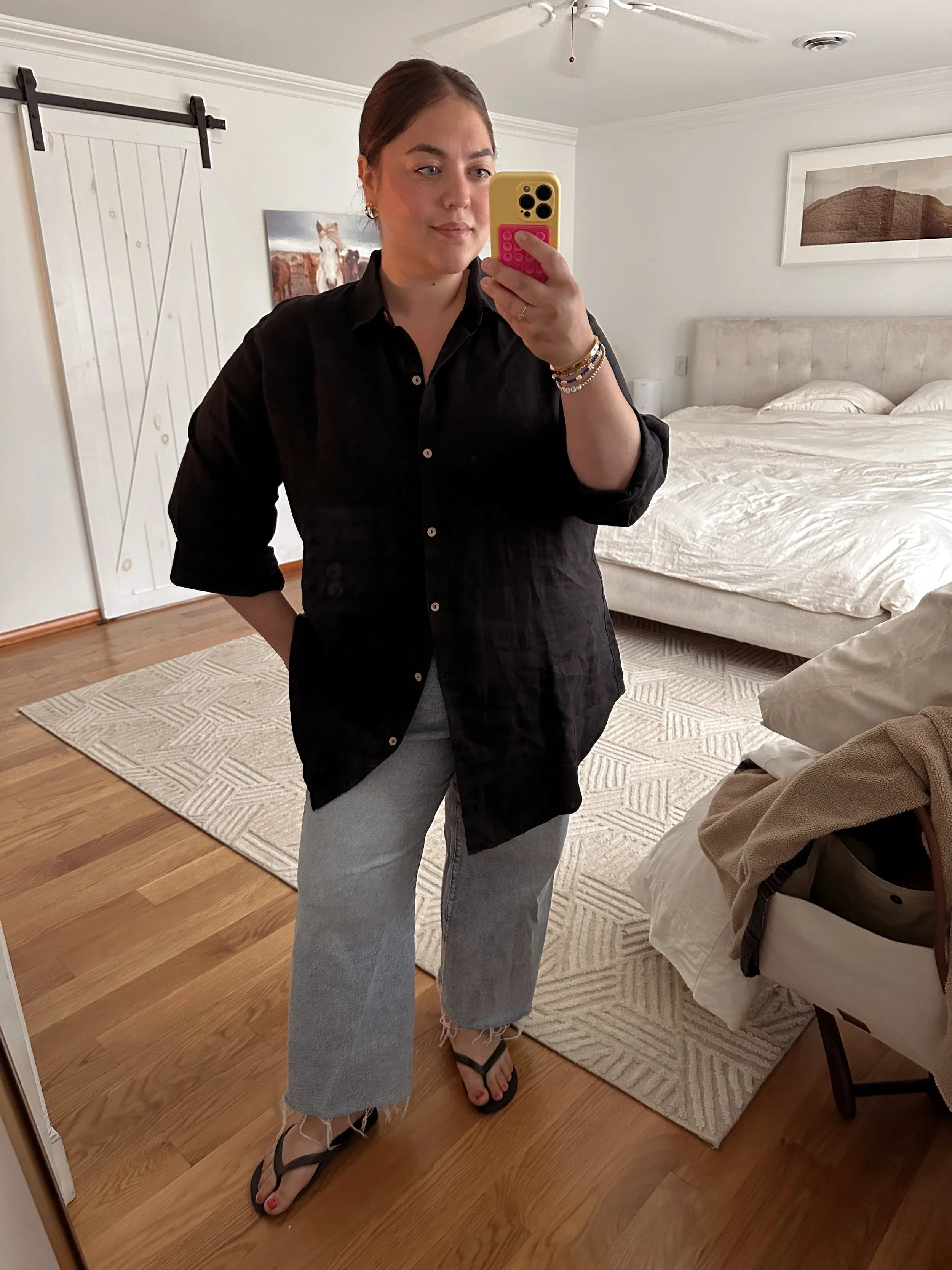 My favorite warm weather staple is a lightweight button up. Wear it on its own or layered, you’ll feel put together easily.